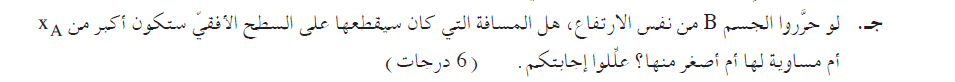 ازاحة الجسم على السطح الأفقي لا تتعلق بكتلة الجسم، وبالتالي فإن ازاحة حركة الجسم B على السطح الأفقي تساوي ازاحة حركة الجسم A.