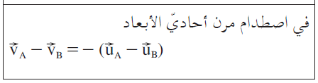 4. تعبير فرق السرعات: «math xmlns=¨http://www.w3.org/1998/Math/MathML¨»«mstyle mathsize=¨20px¨»«msub»«mover mathcolor=¨#FF0000¨»«mi mathvariant=¨bold¨»V«/mi»«mo mathvariant=¨bold¨»§#8594;«/mo»«/mover»«mi mathvariant=¨bold¨ mathcolor=¨#FF0000¨»A«/mi»«/msub»«mo mathvariant=¨bold¨ mathcolor=¨#FF0000¨»-«/mo»«msub»«mover mathcolor=¨#FF0000¨»«mi mathvariant=¨bold¨»V«/mi»«mo mathvariant=¨bold¨»§#8594;«/mo»«/mover»«mi mathvariant=¨bold¨ mathcolor=¨#FF0000¨»B«/mi»«/msub»«mo mathvariant=¨bold¨ mathcolor=¨#FF0000¨»=«/mo»«mo mathvariant=¨bold¨ mathcolor=¨#FF0000¨»-«/mo»«mrow mathcolor=¨#FF0000¨»«mo mathvariant=¨bold¨»(«/mo»«msub»«mover»«mi mathvariant=¨bold¨»U«/mi»«mo mathvariant=¨bold¨»§#8594;«/mo»«/mover»«mi mathvariant=¨bold¨»A«/mi»«/msub»«mo mathvariant=¨bold¨»-«/mo»«msub»«mover»«mi mathvariant=¨bold¨»U«/mi»«mo mathvariant=¨bold¨»§#8594;«/mo»«/mover»«mi mathvariant=¨bold¨»B«/mi»«/msub»«mo mathvariant=¨bold¨»)«/mo»«/mrow»«/mstyle»«/math» لا يمكن استخدامه إلا في حالة الاصطدام الذي يتم فيه حفظ الطاقة الحركية .