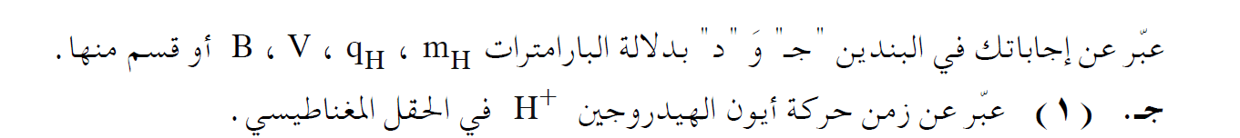 زمن حركة أيون الهيدروجين هو: «math xmlns=¨http://www.w3.org/1998/Math/MathML¨»«mi mathvariant=¨bold¨»t«/mi»«mo mathvariant=¨bold¨»=«/mo»«mfrac»«mrow»«mi mathvariant=¨bold¨»§#960;«/mi»«mo mathvariant=¨bold¨»§#183;«/mo»«msub»«mi mathvariant=¨bold¨»m«/mi»«mi mathvariant=¨bold¨»H«/mi»«/msub»«/mrow»«mrow»«mi mathvariant=¨bold¨»B«/mi»«mo mathvariant=¨bold¨»§#183;«/mo»«mi mathvariant=¨bold¨»q«/mi»«/mrow»«/mfrac»«/math»
