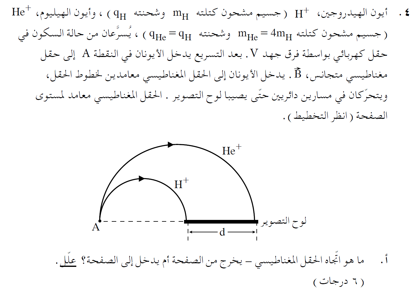 أيون الهيدروجين وأيون الهيليوم مشحونان بشحنة موجبة، فعندما تكون الأيونات في النقطة A تؤثر عليهما قوة إلى اليمين حسب اتجاه حركتهما وحسب قاعدة اليد اليسرى ينتج أنّ اتجاه الحقل المغناطيسي نحو الخارج.