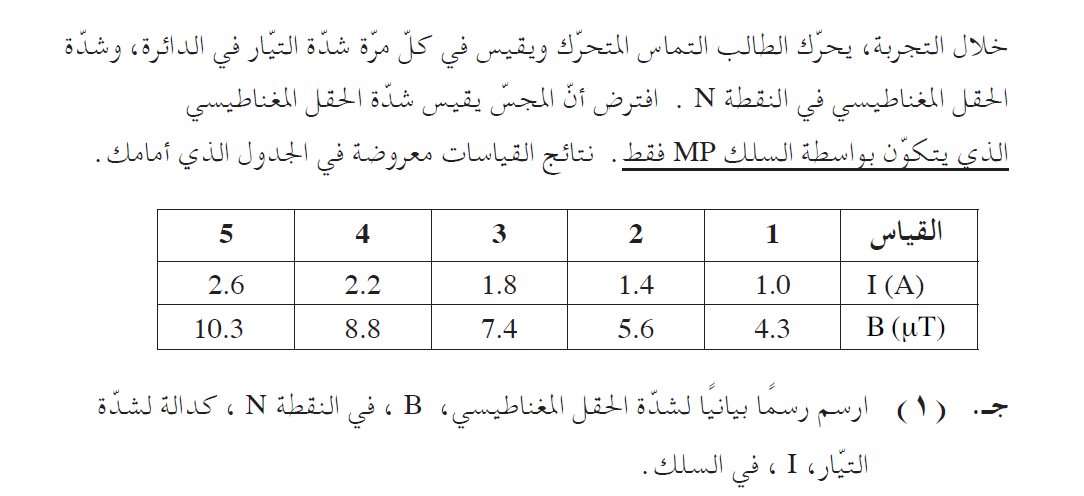 1. يصف الجدول قيم التيار والحقل المغناطيسي على التوالي في خمسة قياسات.