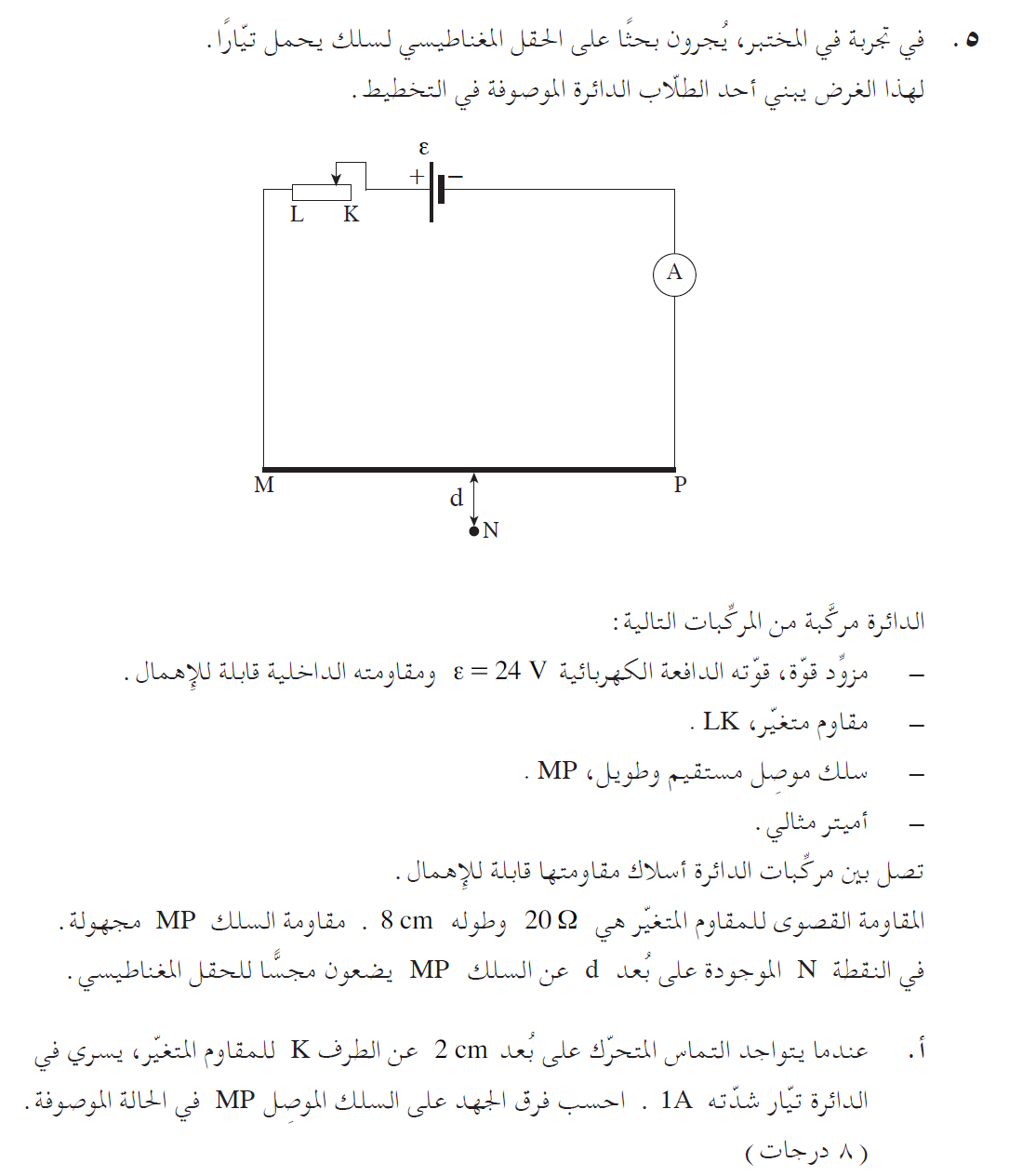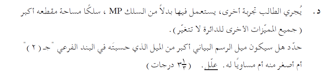 2. إذا تم استبدال سلك MP بسلك آخر مساحة مقطعه العرضي أكبر، من تعبير مقاومة السلك «math xmlns=¨http://www.w3.org/1998/Math/MathML¨»«mi mathvariant=¨bold¨ mathcolor=¨#FF0000¨»R«/mi»«mo mathvariant=¨bold¨ mathcolor=¨#FF0000¨»=«/mo»«mfrac mathcolor=¨#FF0000¨»«mrow»«mi mathvariant=¨bold¨»§#961;«/mi»«mo mathvariant=¨bold¨»§#183;«/mo»«mi mathvariant=¨bold¨»L«/mi»«/mrow»«mi mathvariant=¨bold¨»A«/mi»«/mfrac»«/math» مقاومة السلك الجديد تكون أصغر. وستكون المقاومة المحصّلة أصغر، وسيكون التيار أكبر، لكن البعد d لا يتغير، وبالتالي يكون الميل ثابتًا.