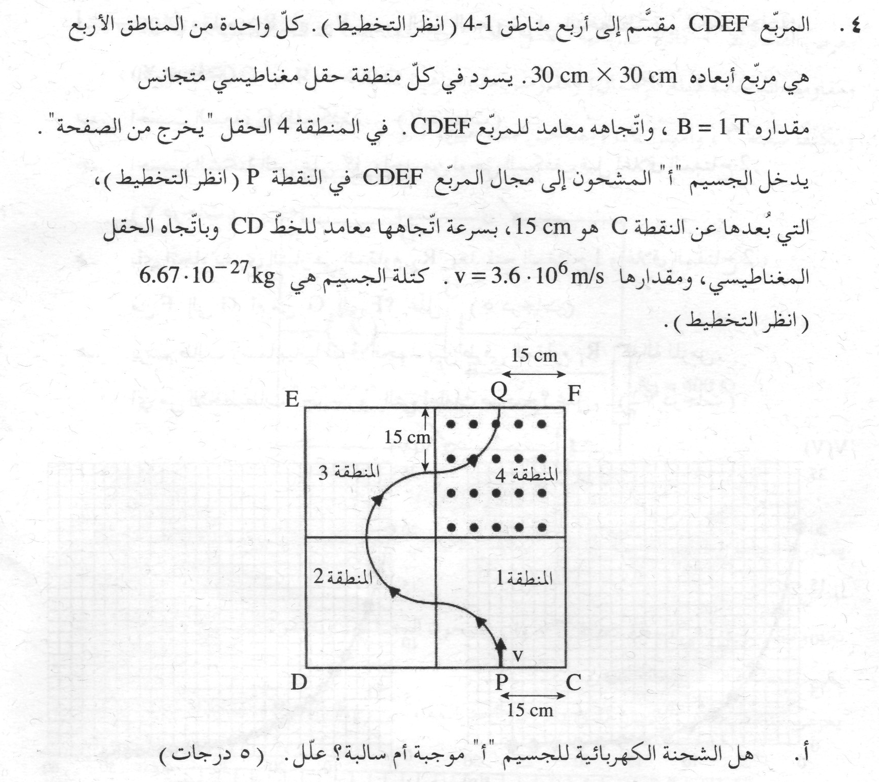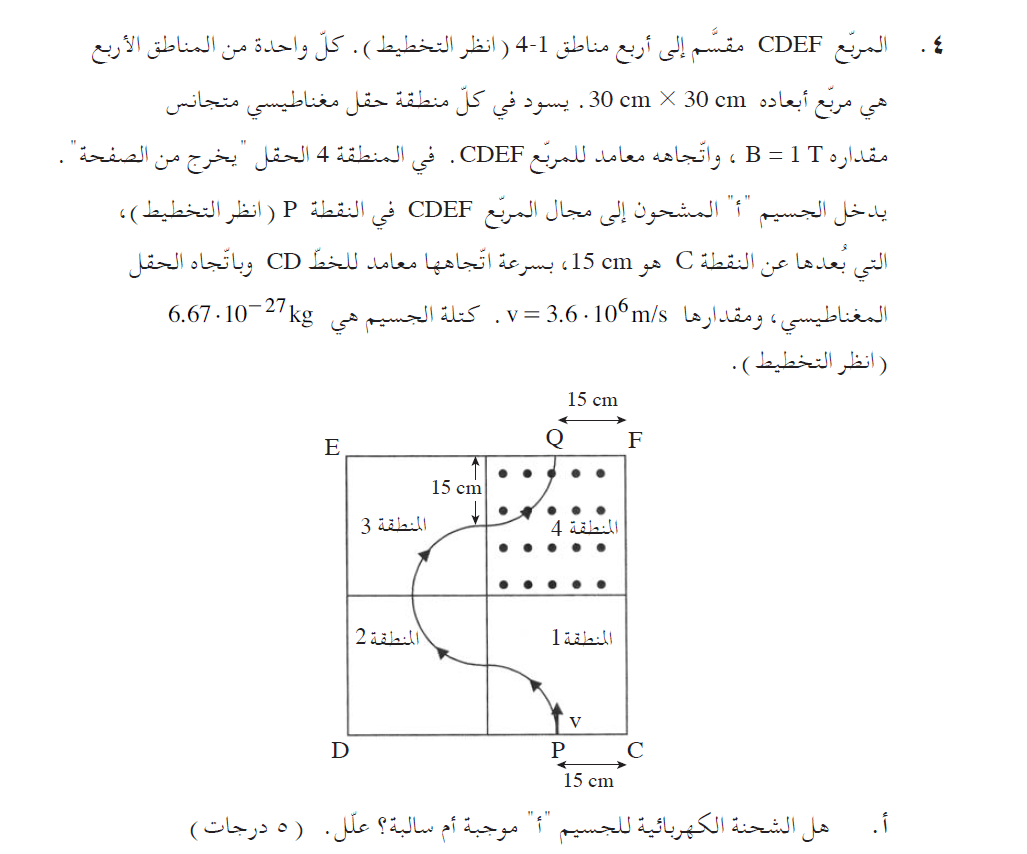 2. يجب تحديد إشارة الشحنة من حركة الشحنة في المنطقة 4، لأن اتجاه الحقل المغناطيسي محدّد في هذه المنطقة فقط.
