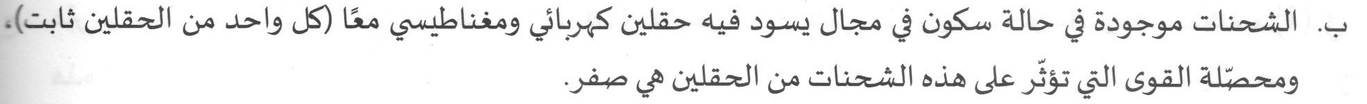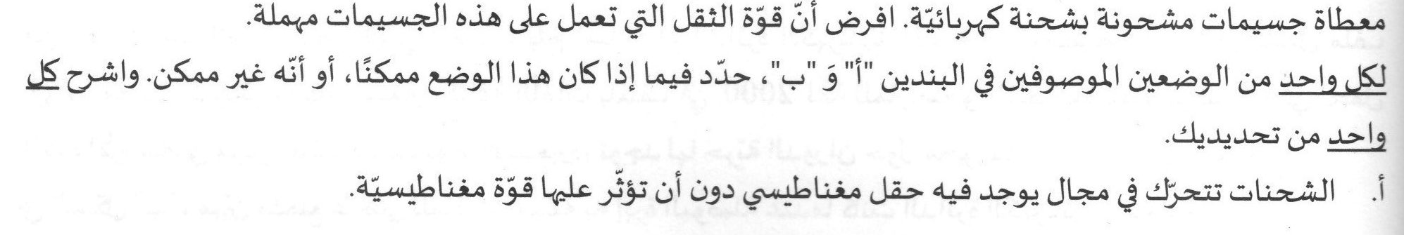 ب - غير ممكن - تؤثر القوة المغناطيسية فقط على شحنة متحركة، وعندما تكون الشحنة في حالة سكون فإن القوة الكهربائية فقط هي التي تؤثر.وبالتالي ستتحرك الشحنة ولن تبقى ساكنة.