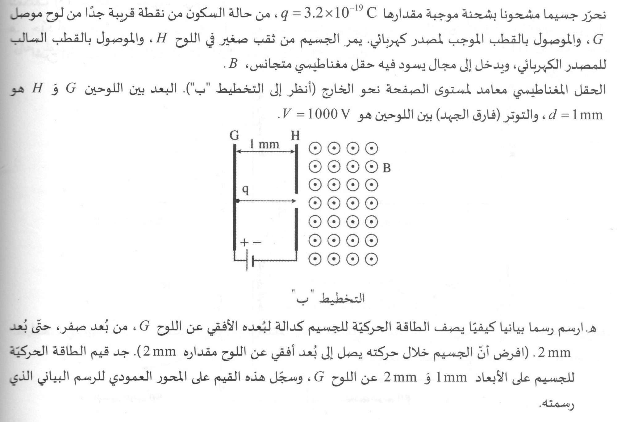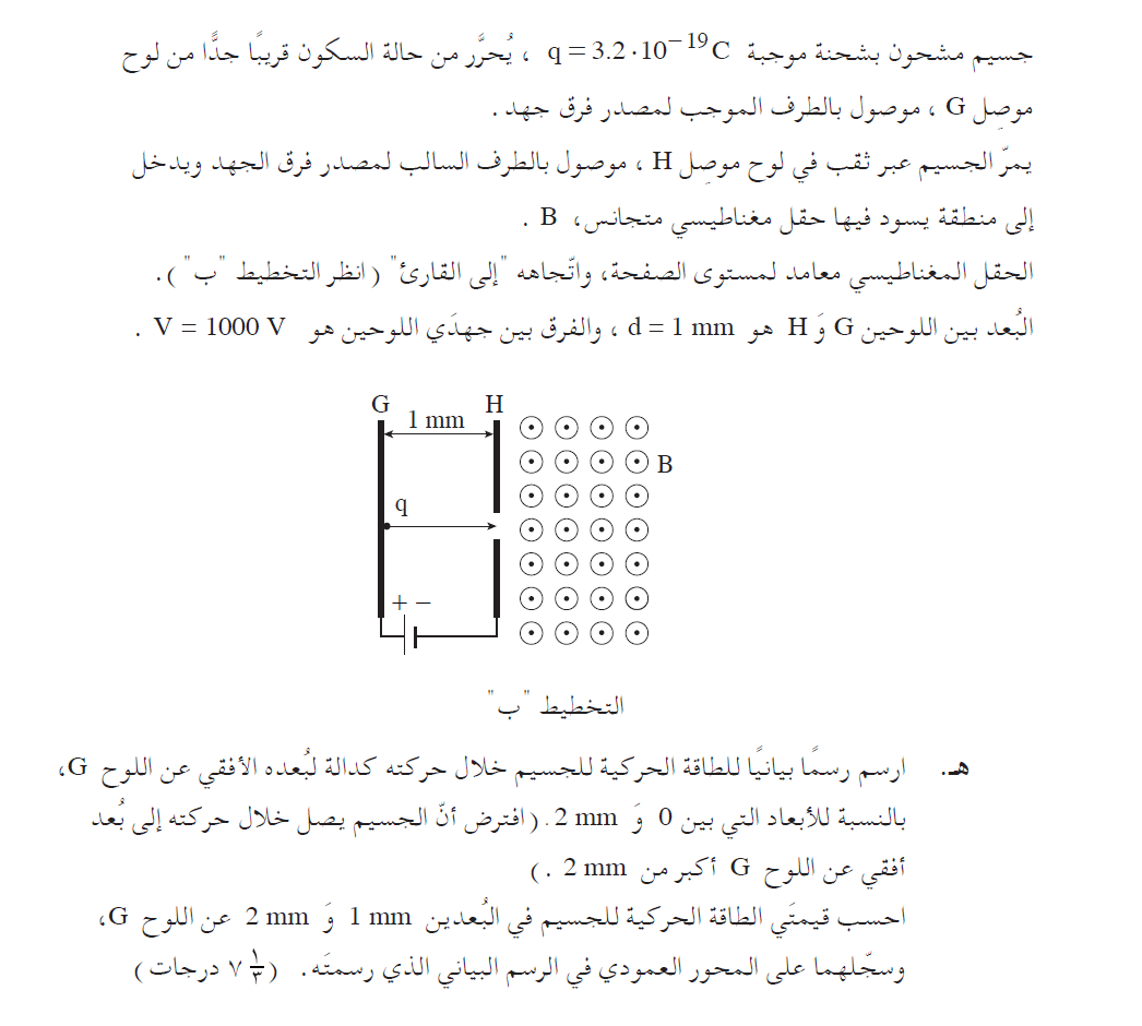 2. من التعبير عن الطاقة الحركية للجسيم بين اللوحين بدلالة الموقع: «math xmlns=¨http://www.w3.org/1998/Math/MathML¨»«mo mathvariant=¨bold¨ mathcolor=¨#FF0000¨»§#160;«/mo»«msub»«mi mathvariant=¨bold¨ mathcolor=¨#FF0000¨»E«/mi»«mi mathvariant=¨bold¨ mathcolor=¨#FF0000¨»K«/mi»«/msub»«mo mathvariant=¨bold¨ mathcolor=¨#FF0000¨»(«/mo»«mi mathvariant=¨bold¨ mathcolor=¨#FF0000¨»X«/mi»«mo mathvariant=¨bold¨ mathcolor=¨#FF0000¨»)«/mo»«mo mathvariant=¨bold¨ mathcolor=¨#FF0000¨»=«/mo»«mi mathvariant=¨bold¨ mathcolor=¨#FF0000¨»m«/mi»«mo mathvariant=¨bold¨ mathcolor=¨#FF0000¨»§#183;«/mo»«mi mathvariant=¨bold¨ mathcolor=¨#FF0000¨»a«/mi»«mo mathvariant=¨bold¨ mathcolor=¨#FF0000¨»§#183;«/mo»«mi mathvariant=¨bold¨ mathcolor=¨#FF0000¨»X«/mi»«/math» يمكن ملاحظة أن الطاقة الحركية تتعلق خطيًا على الموقع. بدلًا منتطوير تعبير للطاقة الحركية بدلالة الموقع وفقًا لمعطيات السؤال، يمكن حساب الطاقة الحركية للجسيم عند وصوله إلى اللوح H، وذلك بالاستعانة بقانون الشغل والطاقة: