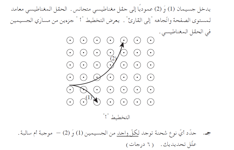 3. في التخطيط (أ)، تظهر الجسيمات التي تتحرك في حقل مغناطيسي، لكنلا توجد علاقة للتخطيط بالبندين الأولين.