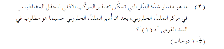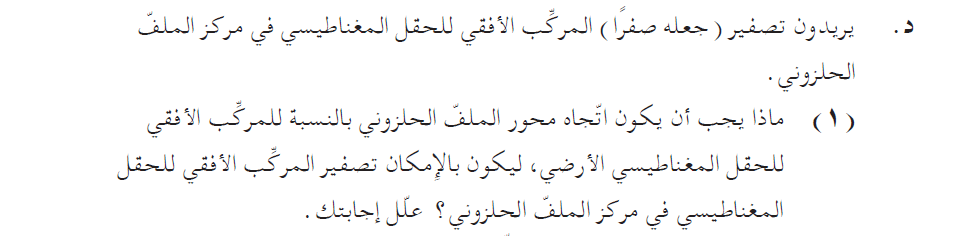 1. حتى نجعل المركّب الأفقي للحقل المغناطيسي الأرضي صفرًا، لا يكفي أن يكون محور الملف في اتجاه الشمال والجنوب.