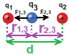 סכום המרחקים r2,3 ו- r1,3 שווה למרחק d, שערכו 2 מטרים.