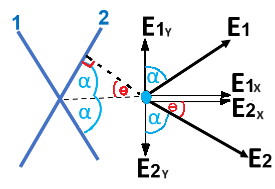 בכיוון ציר Y השדות E1Y ו- E2Y מתקזזים. השדה השקול בנקודה A שווה לסכום השדות E1X ו- E2X