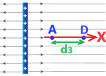 נתייחס למטען בוחן הנע מנקודה A לנקודה D,  נסמן את המרחק בין הנקודה A לנקודה D ב d3 .
