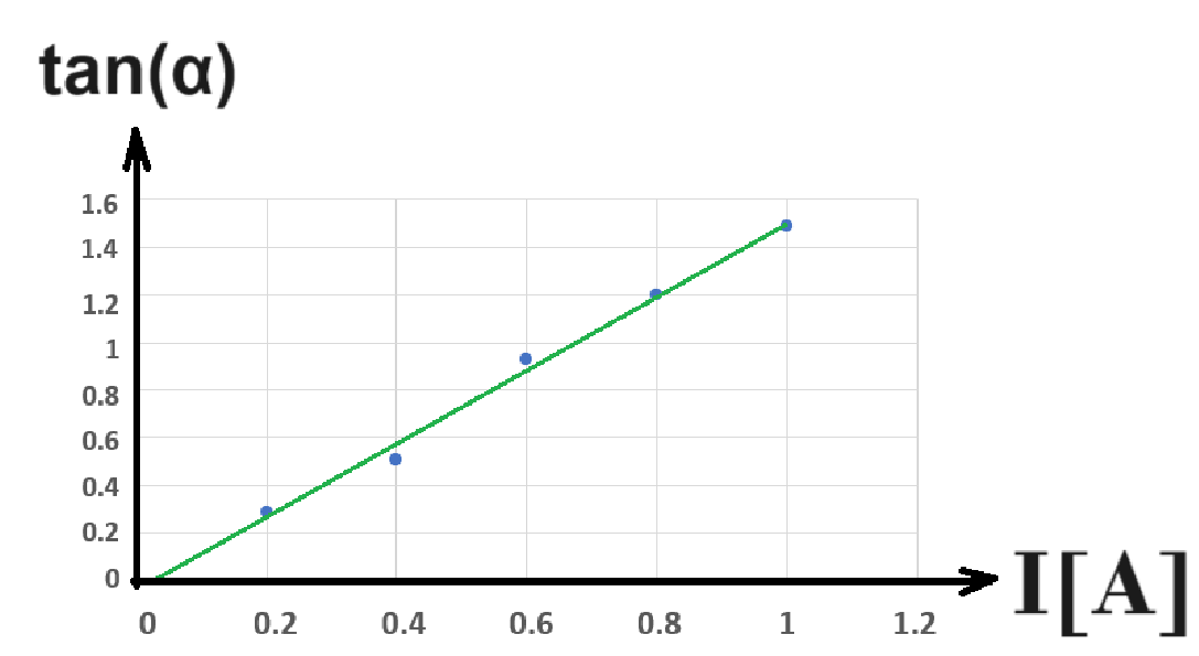נערוך גרף המתאר את טנגנס זווית הסטייה כתלות בעוצמת הזרם בסילונית, בהתאם לערכי המדידות המופיעים בטבלה.