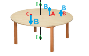 מכלל יד ימין בהתאם לכיוון הזרם , בנקודה C כיוון השדה המגנטי הוא החוצה מהדף ובנקודות A ו- B כיוון השדה המגנטי הוא פנימה לתוך הדף.