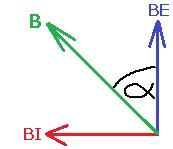 נערוך תרשים לשדה המגנטי המגנטי הנוצר מכדור הארץ - BE. לשדה המגנטי הנוצר מהסילונית - BI ולשדה המגנטי השקול - B.