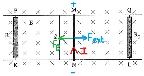המוט נע במהירות קבועה, מהחוק הראשון של ניוטון שקול הכוחות הפועלים על המוט שווה לאפס, לכן בנוסף לכוח המגנטי פועל כוח חיצוני השווה בגודלו לכוח המגנטי ומנוגד לו בכיוונו.