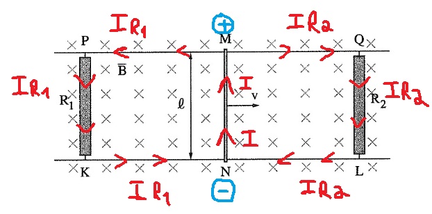 כיוון הזרם דרך R1 הוא מנקודה P לנקודה K. וכיוון הזרם דרך R2 הוא מנקודה Q לנקודה L. ובמוט מנקודה M לנקודה N.