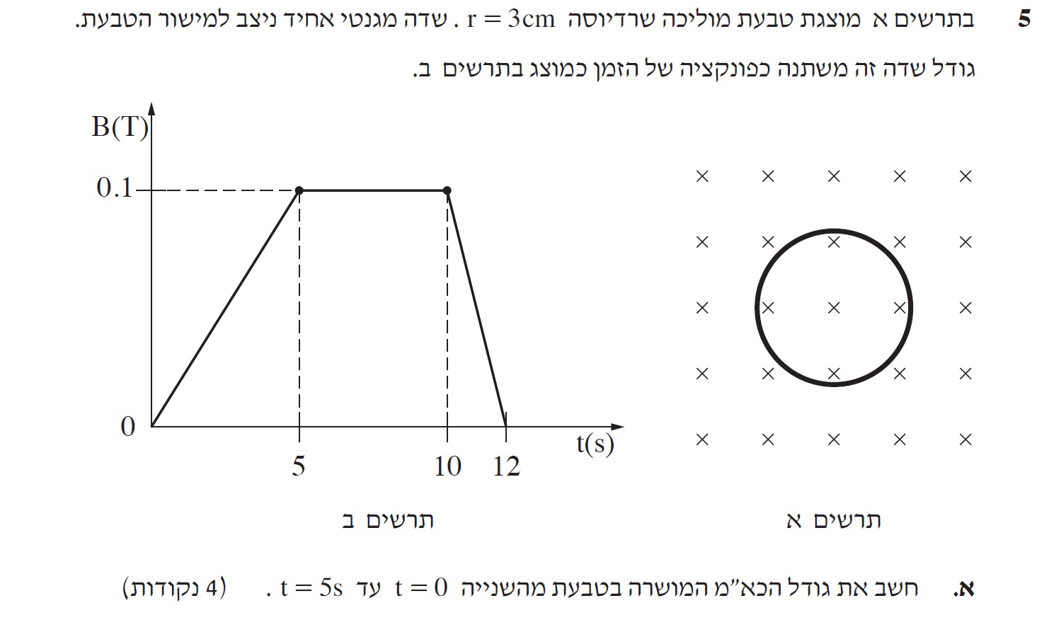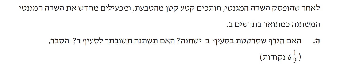 2. בין רגע t=10s לרגע t=12s עוצמת השדה המגנטי משתנה, אך גודל הכא"מ קבוע.