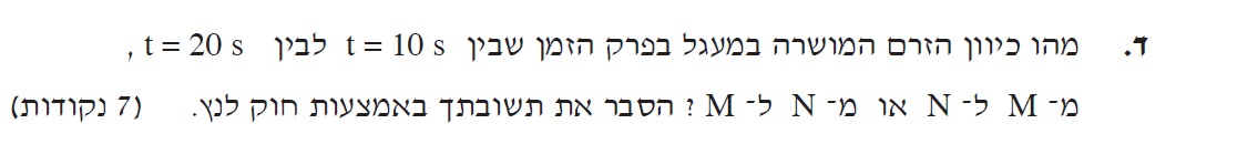 כדי לא לטעות בגלל הנוסח של השאלה, מאוד מומלץ לכתוב את התשובה בצורה מפורטת. אפשר לכתוב כיוון הזרם בנגד הוא מהנקודה N לנקודה M. או לכתוב כיוון הזרם במוט הוא מהנקודה M לנקודה N.