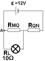 מעקרונות המעגל הטורי, כדי שהמתח על הנורה יהיה 3 וולט והמתח על RQN יהיה 9 וולט ההתנגדות השקולה של הנורה ו RMQ צריכה להיות קטנה פי 3 מההתנגדות של RQN. נכתוב בהתאם משוואת התנגדויות: