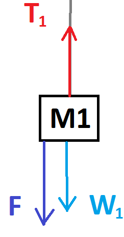 על גוף 1 פועלים שלושה כוחות: כוח חיצוני F, כוח הכובד W1 וכוח המתיחות T1.