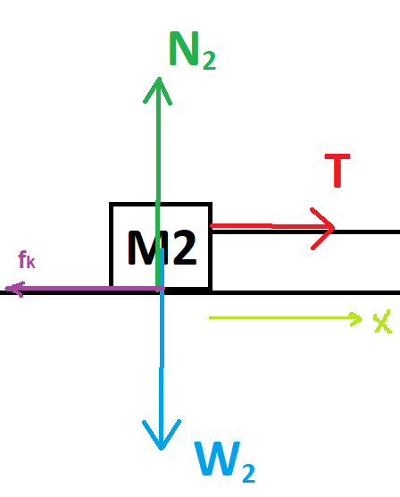 על גוף 2 פועלים 4 כוחות: כוח המתיחות T, כוח החיכוך fk, כוח כובד W2 וכוח הנורמל N.