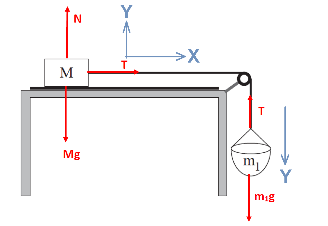 נתייחס לשני הגופים כאל גוף אחד שמסתו «math xmlns=¨http://www.w3.org/1998/Math/MathML¨»«mstyle mathsize=¨20px¨»«msub»«mi mathvariant=¨bold¨ mathcolor=¨#0000FF¨»m«/mi»«mn mathvariant=¨bold¨ mathcolor=¨#0000FF¨»1«/mn»«/msub»«mo mathvariant=¨bold¨ mathcolor=¨#0000FF¨»+«/mo»«mi mathvariant=¨bold¨ mathcolor=¨#0000FF¨»M«/mi»«/mstyle»«/math» המונעים במשקל הסל «math xmlns=¨http://www.w3.org/1998/Math/MathML¨»«mstyle mathsize=¨22px¨»«msub»«mi mathvariant=¨bold¨ mathcolor=¨#0000FF¨»m«/mi»«mn mathvariant=¨bold¨ mathcolor=¨#0000FF¨»1«/mn»«/msub»«mo mathvariant=¨bold¨ mathcolor=¨#0000FF¨»§#183;«/mo»«mi mathvariant=¨bold¨ mathcolor=¨#0000FF¨»g«/mi»«/mstyle»«/math».