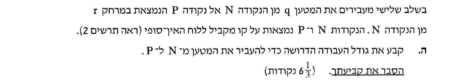 תחילה המטען היה ממוקדם בנקודה O והוא נע בהשפעת כוח חיצוני. בתום עבודת הכוח החיצוני המטען ממוקם בנקודה N .
