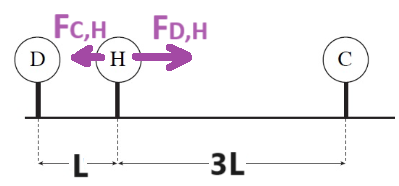 משני ביטויים אלו ניתן לראות שהכוח «math xmlns=¨http://www.w3.org/1998/Math/MathML¨»«mstyle mathsize=¨20px¨»«msub»«mi mathvariant=¨bold¨ mathcolor=¨#0000FF¨»F«/mi»«mrow mathcolor=¨#0000FF¨»«mi mathvariant=¨bold¨»D«/mi»«mo mathvariant=¨bold¨»,«/mo»«mi mathvariant=¨bold¨»H«/mi»«/mrow»«/msub»«/mstyle»«/math» גדול פי 3 מהכוח «math xmlns=¨http://www.w3.org/1998/Math/MathML¨»«mstyle mathsize=¨20px¨»«msub»«mi mathvariant=¨bold¨ mathcolor=¨#0000FF¨»F«/mi»«mrow mathcolor=¨#0000FF¨»«mi mathvariant=¨bold¨»C«/mi»«mo mathvariant=¨bold¨»,«/mo»«mi mathvariant=¨bold¨»H«/mi»«/mrow»«/msub»«/mstyle»«/math» . שקול הכוחות הפועלים על המטען H שונה מאפס.
