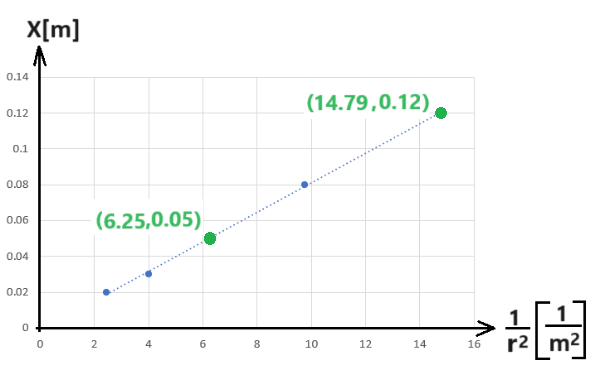 לכן, בגרף המתאר את X בתלות ב- «math xmlns=¨http://www.w3.org/1998/Math/MathML¨»«mfrac»«mn mathvariant=¨bold¨»1«/mn»«msup»«mi mathvariant=¨bold¨»r«/mi»«mn mathvariant=¨bold¨»2«/mn»«/msup»«/mfrac»«/math» הגרף הוא ליניארי.