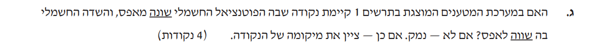 1. אין צורך לנמק מדוע קיימת נקודה כזו, ומדוע היא נמצאת באמצע המרחק בין המטענים, יש רק לציין שהנקודה קיימת ולפרט היכן היא קיימת.