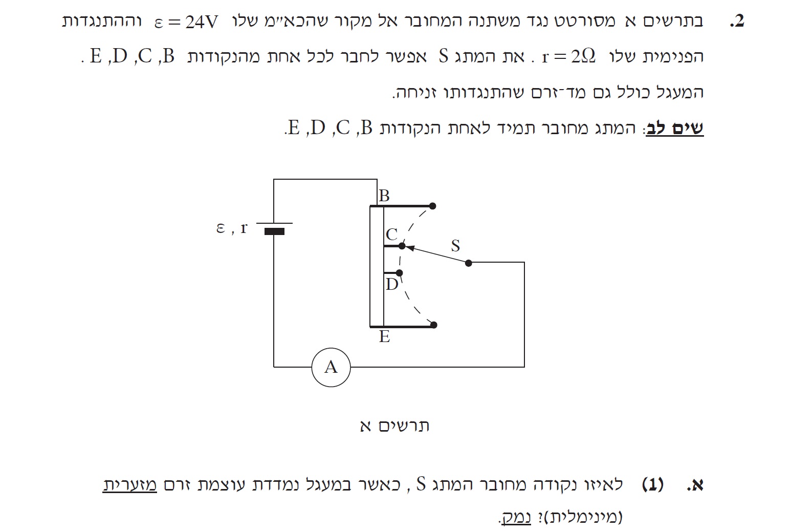 3. כאשר המתג מחובר לנקודה E אורך המוליך דרכו זורם הזרם הוא הגדול ביותר האפשרי, מביטוי התנגדות מוליך «math xmlns=¨http://www.w3.org/1998/Math/MathML¨»«mi mathvariant=¨bold¨ mathcolor=¨#FF0000¨»R«/mi»«mo mathvariant=¨bold¨ mathcolor=¨#FF0000¨»=«/mo»«mfrac mathcolor=¨#FF0000¨»«mrow»«mi mathvariant=¨bold¨»§#961;«/mi»«mo mathvariant=¨bold¨»§#183;«/mo»«mi mathvariant=¨bold¨»L«/mi»«/mrow»«mi mathvariant=¨bold¨»A«/mi»«/mfrac»«/math»