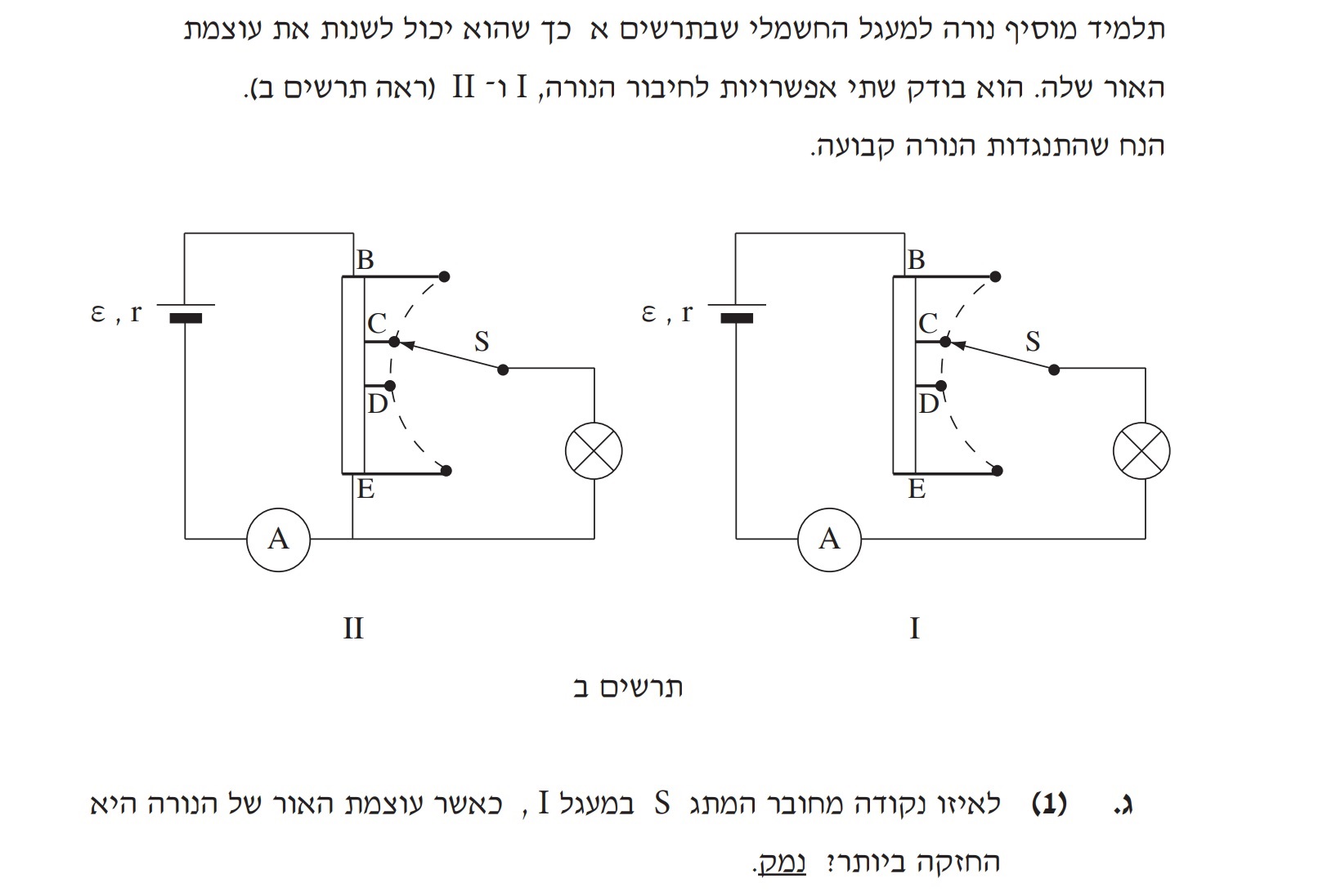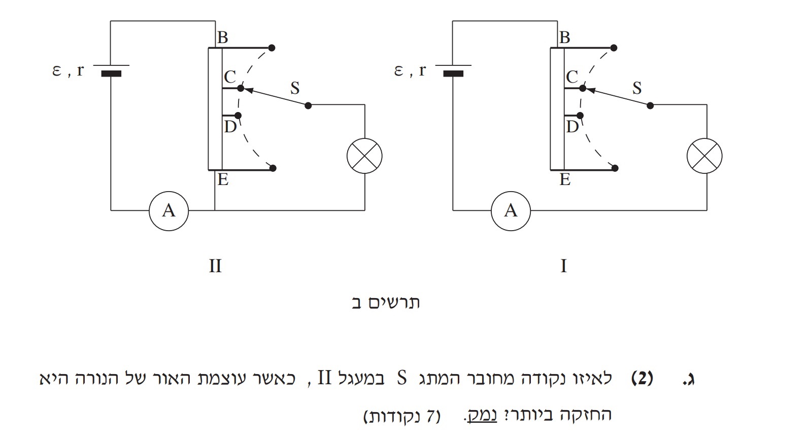 בהתאם לעקרונות החיבור הפוטנציומטרי יש לחבר את המפסק לנקודה B כדי שהמתח על הנורה יהיה מקסימאלי.