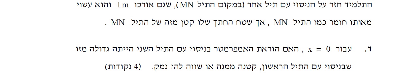 במבוא לשאלה בסעיף ד' כתוב " תיל אחר " , בסעיף ה' יש "תיל ראשון" ו- "תיל שני", ניתן היה לנסח את השאלה בצורה פחות מטעה , מומלץ בתשובה להתייחס לתיל הדק ולתיל העבה.