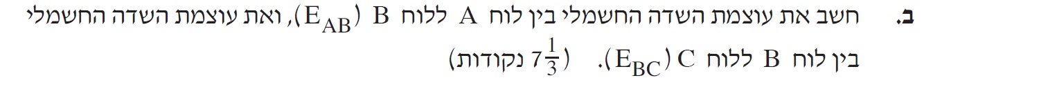 לכן גודל השדה בין לוח A ללוח B הוא 200 וולט למטר , וגודל השדה בין לוח B ללוח C הוא 1200 וולט למטר.