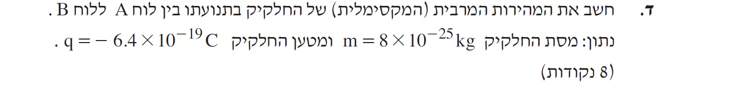 המהירות של החלקיק בצמוד ללוח A שווה לאפס. נציב את ערך המהירות בביטוי , ונבטא את המהירות VB: