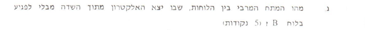 שבמתח זה האלקטרון לא פוגע בלוח. וזה המתח המרבי בי הלוחות שבו יצא האלקטרון מהשדה בלי לפגוע בלוח.