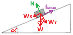 تؤثر ثلاث قوى على الجسم: قوة الجاذبية، وقوة الضغط العمودية، وقوة الاحتكاك الساكن المؤثرة على طول السطح.