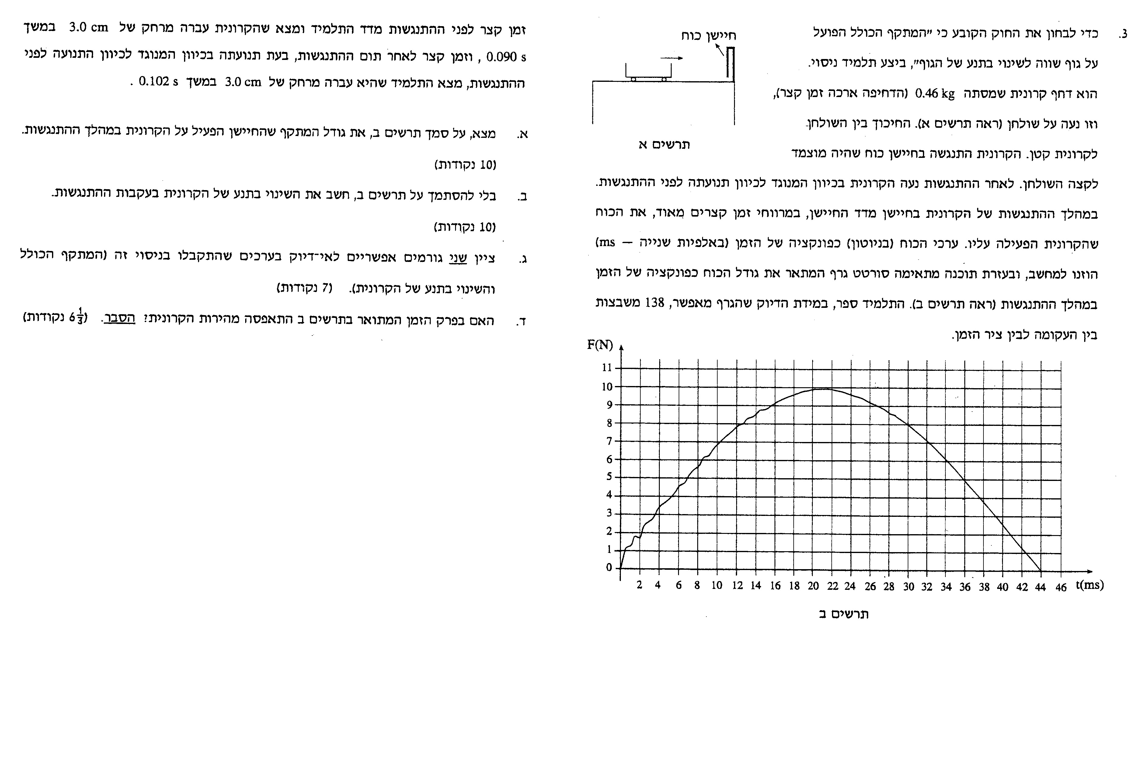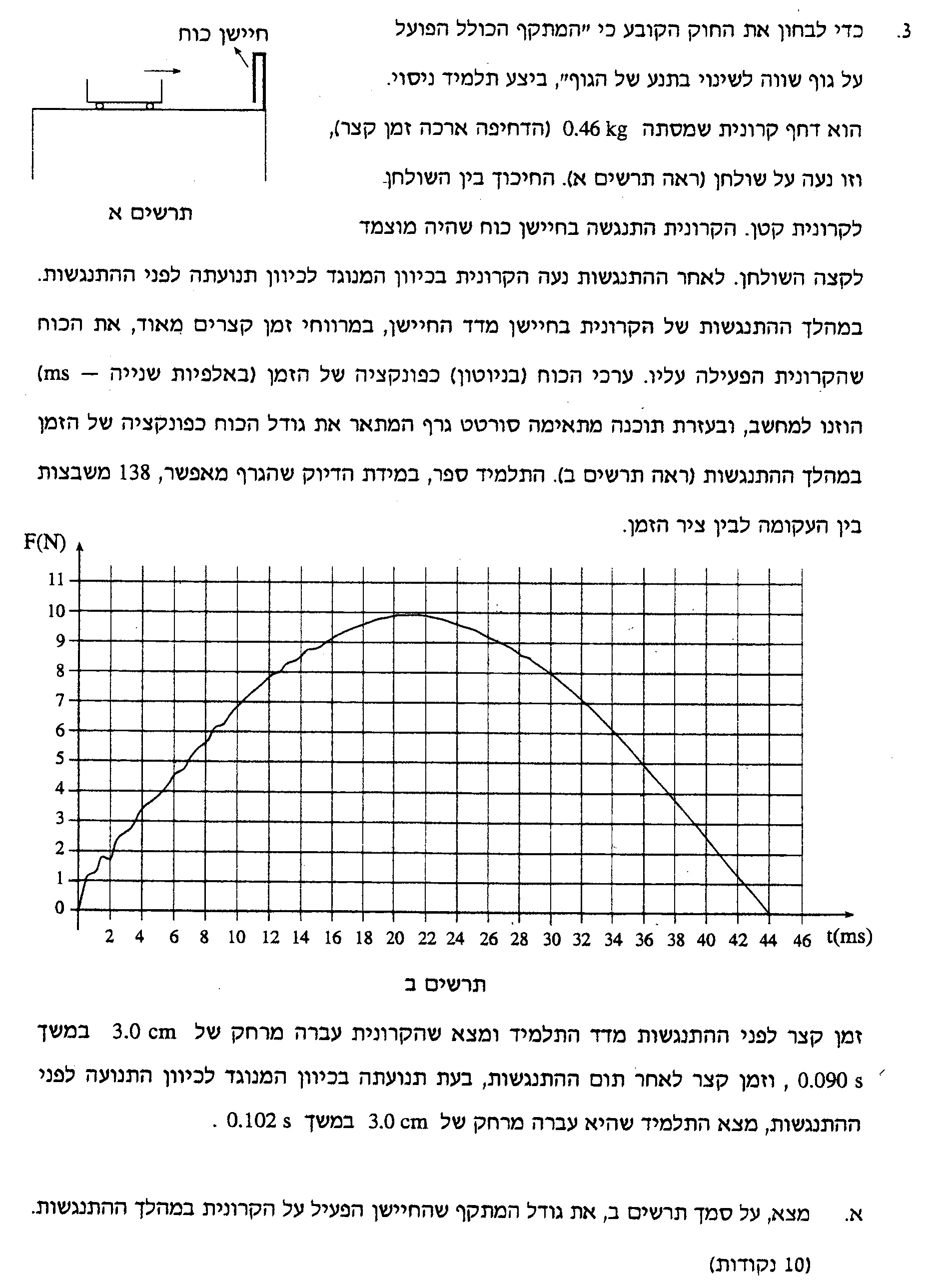 3. הגרף מתאר את הכוח שהקרונית מפעילה על החיישן משמעות השטח בגרף זה היא המתקף שהקרונית מפעילה על החיישן.