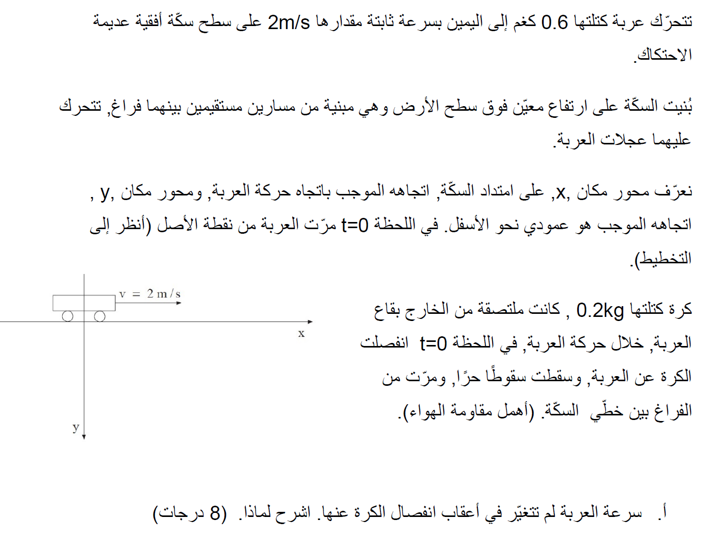 في اللحظة التي تنفصل فيها الكرة عن العربة ، تكون السرعة الأفقية للكرة مساوية لسرعة العربة. من هذه اللحظة تتحرك الكرة تحت تأثير الجاذبية فقط. سنتعامل مع حركة الكرة على أنها حركة برمي أفقي بسرعة 2 متر في الثانية من نقطة بداية المحاور.