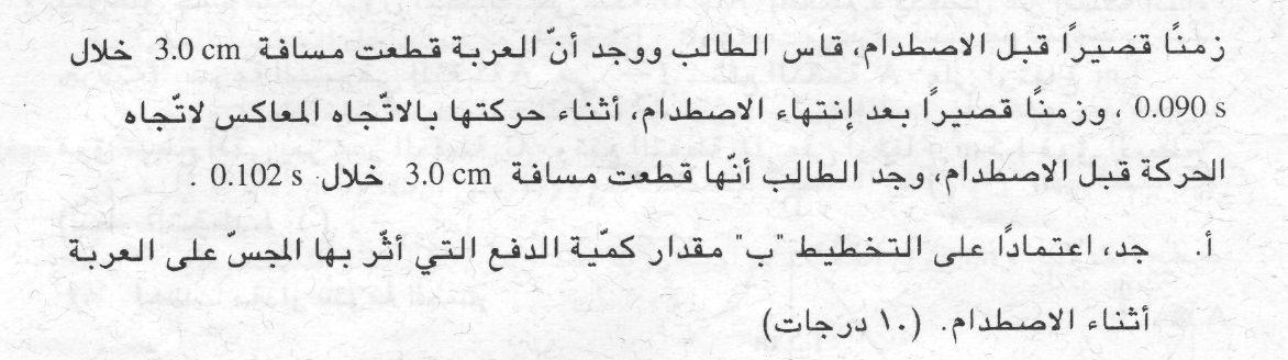 نحسب التغير في كمية الحركة للعربة بعد الاصطدام:«math xmlns=¨http://www.w3.org/1998/Math/MathML¨»«mo mathvariant=¨bold¨ mathcolor=¨#0000FF¨»§#8710;«/mo»«mi mathvariant=¨bold¨ mathcolor=¨#0000FF¨»P«/mi»«mo mathvariant=¨bold¨ mathcolor=¨#0000FF¨»=«/mo»«mi mathvariant=¨bold¨ mathcolor=¨#0000FF¨»m«/mi»«mo mathvariant=¨bold¨ mathcolor=¨#0000FF¨»§#183;«/mo»«mi mathvariant=¨bold¨ mathcolor=¨#0000FF¨»U«/mi»«mo mathvariant=¨bold¨ mathcolor=¨#0000FF¨»-«/mo»«mi mathvariant=¨bold¨ mathcolor=¨#0000FF¨»m«/mi»«mo mathvariant=¨bold¨ mathcolor=¨#0000FF¨»§#183;«/mo»«mi mathvariant=¨bold¨ mathcolor=¨#0000FF¨»V«/mi»«mspace linebreak=¨newline¨/»«mo mathvariant=¨bold¨ mathcolor=¨#0000FF¨»§#8710;«/mo»«mi mathvariant=¨bold¨ mathcolor=¨#0000FF¨»P«/mi»«mo mathvariant=¨bold¨ mathcolor=¨#0000FF¨»=«/mo»«mn mathvariant=¨bold¨ mathcolor=¨#0000FF¨»0«/mn»«mo mathvariant=¨bold¨ mathcolor=¨#0000FF¨».«/mo»«mn mathvariant=¨bold¨ mathcolor=¨#0000FF¨»46«/mn»«mo mathvariant=¨bold¨ mathcolor=¨#0000FF¨»§#183;«/mo»«mo mathvariant=¨bold¨ mathcolor=¨#0000FF¨»(«/mo»«mo mathvariant=¨bold¨ mathcolor=¨#0000FF¨»-«/mo»«mn mathvariant=¨bold¨ mathcolor=¨#0000FF¨»0«/mn»«mo mathvariant=¨bold¨ mathcolor=¨#0000FF¨».«/mo»«mn mathvariant=¨bold¨ mathcolor=¨#0000FF¨»294«/mn»«mo mathvariant=¨bold¨ mathcolor=¨#0000FF¨»)«/mo»«mo mathvariant=¨bold¨ mathcolor=¨#0000FF¨»-«/mo»«mn mathvariant=¨bold¨ mathcolor=¨#0000FF¨»0«/mn»«mo mathvariant=¨bold¨ mathcolor=¨#0000FF¨».«/mo»«mn mathvariant=¨bold¨ mathcolor=¨#0000FF¨»46«/mn»«mo mathvariant=¨bold¨ mathcolor=¨#0000FF¨»§#183;«/mo»«mn mathvariant=¨bold¨ mathcolor=¨#0000FF¨»0«/mn»«mo mathvariant=¨bold¨ mathcolor=¨#0000FF¨».«/mo»«mn mathvariant=¨bold¨ mathcolor=¨#0000FF¨»33«/mn»«mo mathvariant=¨bold¨ mathcolor=¨#0000FF¨»=«/mo»«mo mathvariant=¨bold¨ mathcolor=¨#0000FF¨»-«/mo»«mn mathvariant=¨bold¨ mathcolor=¨#0000FF¨»0«/mn»«mo mathvariant=¨bold¨ mathcolor=¨#0000FF¨».«/mo»«mn mathvariant=¨bold¨ mathcolor=¨#0000FF¨»287«/mn»«mi mathvariant=¨bold¨ mathcolor=¨#0000FF¨»N«/mi»«mo mathvariant=¨bold¨ mathcolor=¨#0000FF¨»§#183;«/mo»«mi mathvariant=¨bold¨ mathcolor=¨#0000FF¨»S«/mi»«/math»
