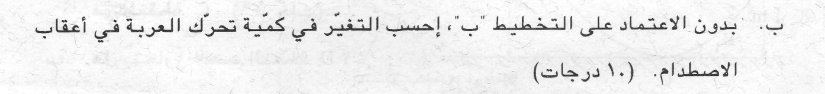 بمساعدة معطيات حركة العربة قبل الاصطدام وبعده، من الممكن حساب السرعة قبل الاصطدام وبعده.
