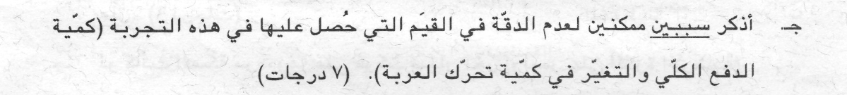 2. عدم دقة الطالب في قياس الازاحة وأوقات حركة العربة.