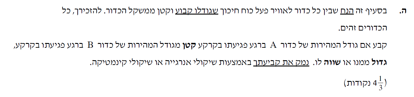 לכן המקרה דומה לשני כדורים זהים שנזרקו מאותו גובה כלפי מטה, כדור A נזרק במהירות גדולה וכדור B במהירות קטנה, לכן לכדור B תהיה מהירות קטנה יותר ברגע הפגיעה בקרקע.