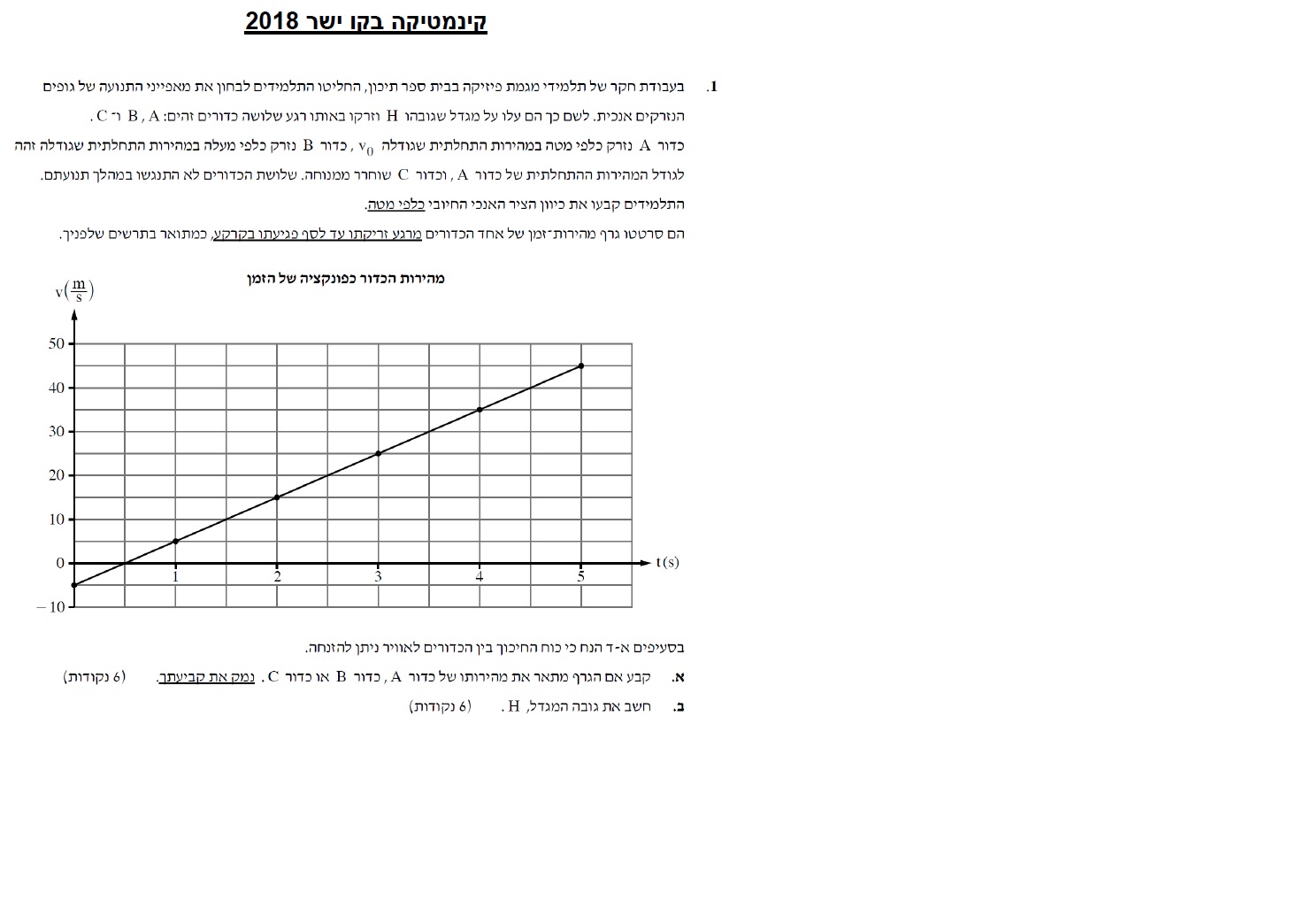 גודל המהירות ההתחלתית של כדור B נתון בגרף, לכדור A יש מהירות זהה בגודלה ,אך שונה בסימונה.