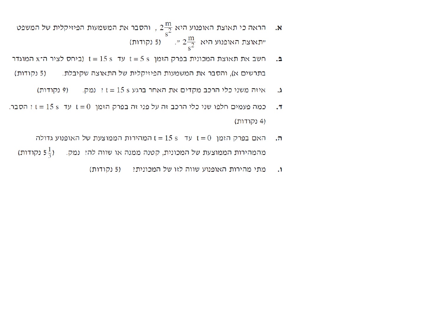 מכיוון שהתאוצות קבועות, נשתמש בפונקציית המהירות בתלות בזמן לתיאור מהירות כל אחד מכלי הרכב בתנועות אלו.