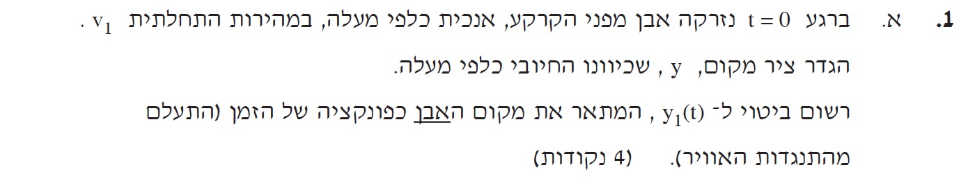 ביחס לציר שראשיתו בקרקע: «math xmlns=¨http://www.w3.org/1998/Math/MathML¨»«mstyle mathsize=¨18px¨»«msub»«mi mathvariant=¨bold¨»y«/mi»«mn mathvariant=¨bold¨»1«/mn»«/msub»«mo mathvariant=¨bold¨»(«/mo»«mi mathvariant=¨bold¨»t«/mi»«mo mathvariant=¨bold¨»)«/mo»«mo mathvariant=¨bold¨»=«/mo»«msub»«mi mathvariant=¨bold¨»V«/mi»«mn mathvariant=¨bold¨»1«/mn»«/msub»«mo mathvariant=¨bold¨»§#183;«/mo»«msub»«mi mathvariant=¨bold¨»t«/mi»«mn mathvariant=¨bold¨»1«/mn»«/msub»«mo mathvariant=¨bold¨»-«/mo»«mn mathvariant=¨bold¨»5«/mn»«mo mathvariant=¨bold¨»§#183;«/mo»«msup»«msub»«mi mathvariant=¨bold¨»t«/mi»«mn mathvariant=¨bold¨»1«/mn»«/msub»«mn mathvariant=¨bold¨»2«/mn»«/msup»«/mstyle»«/math»