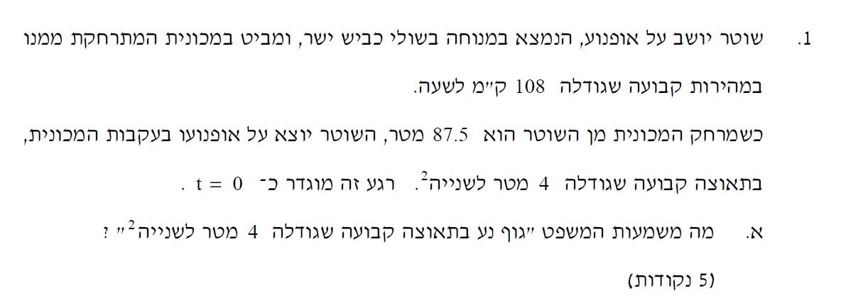 המכונית נעה במהירות 108 קמ"ש , מהירות זו ביחידות תקניות שווה ל 30 מטר לשנייה(מחלקים ב 3.6).