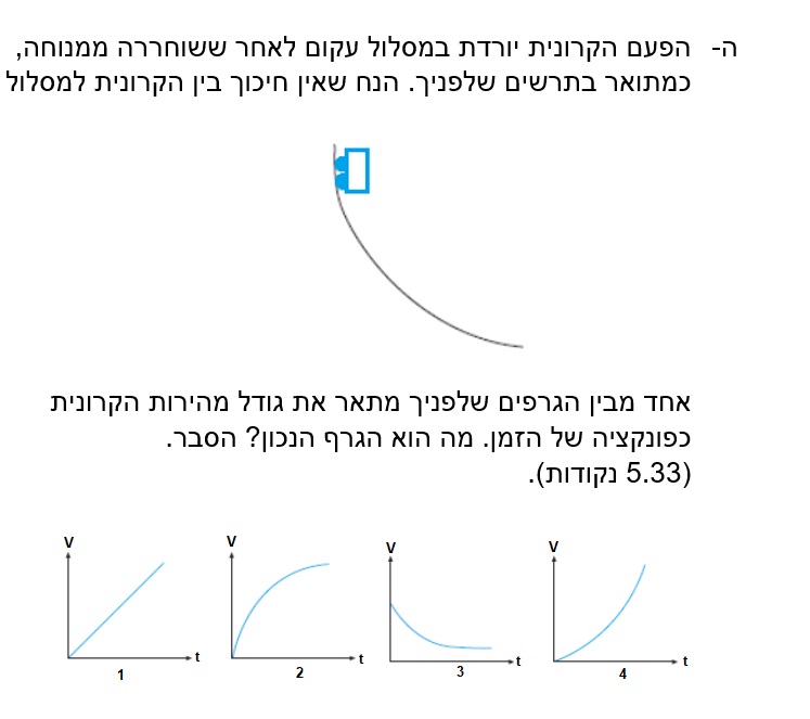 גרף 3 הוא הגרף היחיד שמתאים , מכיוון שהשיפוע הולך וקטן , המהירות בהתחלה היא אפס. והמהירות שואפת לערך קבוע.