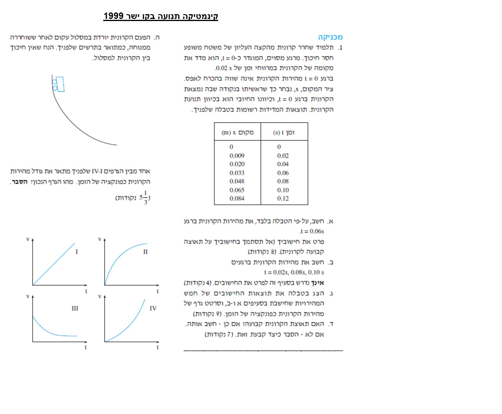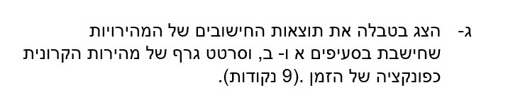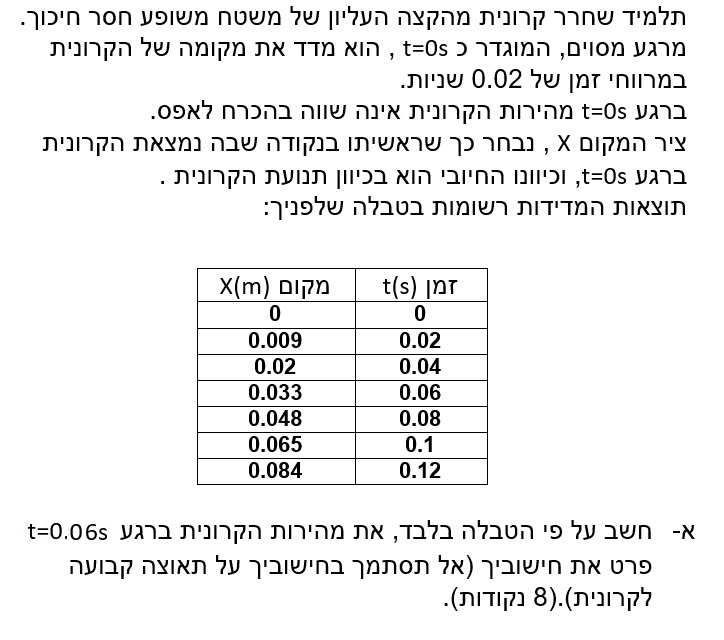 יש לסמן בגרף מהירות בתלות בזמן את ערכי המהירויות הרגעיות שמצאנו בסעיפים קודמים. ולהעביר את הישר המסתבר ביותר. חשוב לתכנן את ערכי הערכים בצירים, יש לקבוע את הערך המקסימאלי בכל ציר , ערכי השנתות חייבים להתחיל מאפס ולגדול בצורה קבועה.