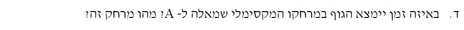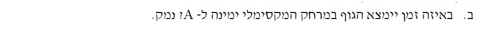 ברגע t=0s הגוף נמצא בנקודה A, הוא נע ימינה כל עוד ערך המהירות חיובי , והוא נע שמאלה כל עוד ערך המהירות שלילי. מהגרף ניתן לראות שהגוף נע ימינה עד לרגע t=7s . ולאחר מכן המהירות שלילית הגוף נע שמאלה. לכן ברגע t=7s הגוף נמצא במרחק המקסמאלי ימינה מהנקודה A.