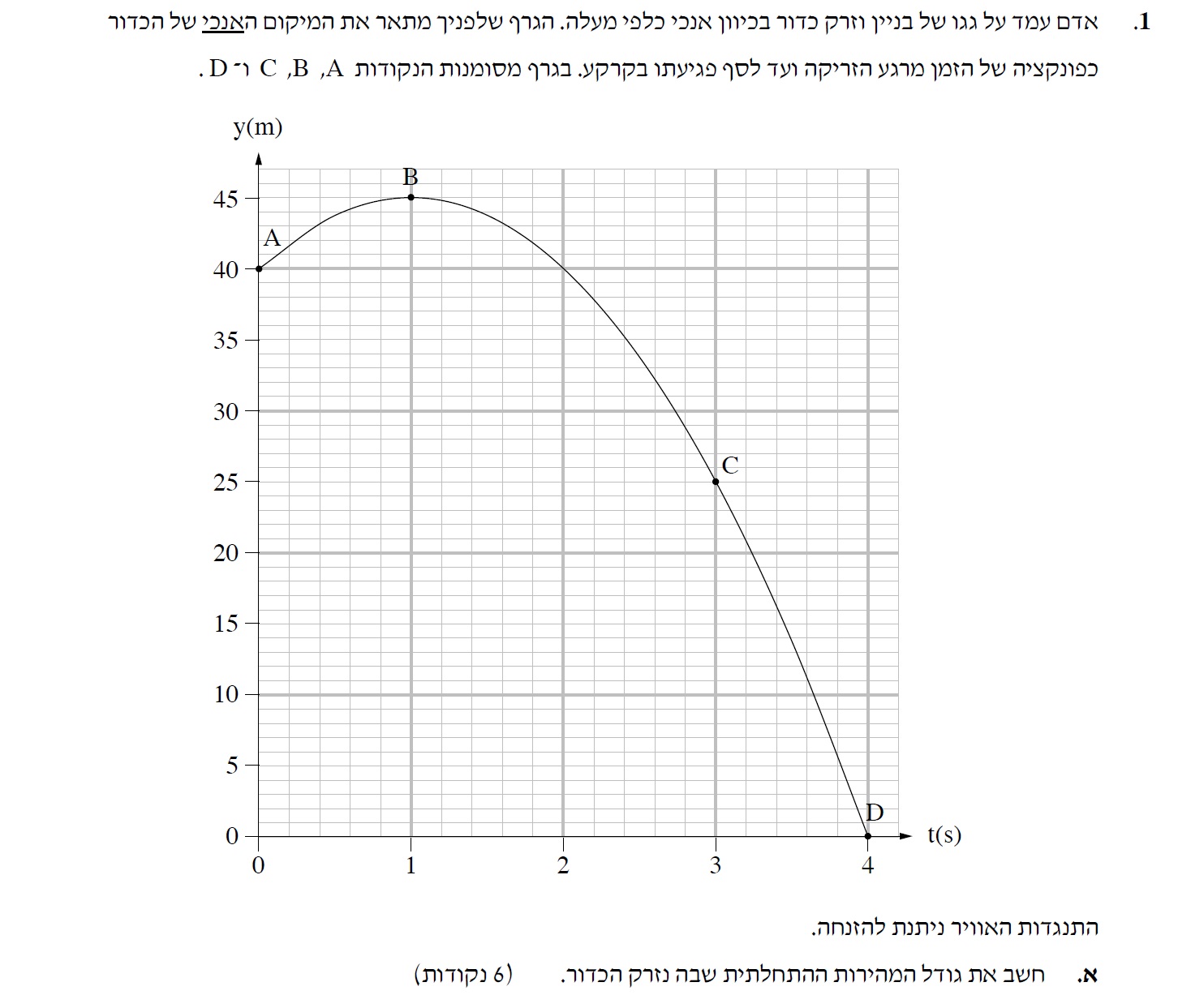 1. לא מדובר על זריקה בזווית. הגרף הוא «math xmlns=¨http://www.w3.org/1998/Math/MathML¨»«mstyle mathsize=¨20px¨»«mrow»«mi mathvariant=¨bold-italic¨ mathcolor=¨#FF0000¨»Y«/mi»«mo mathvariant=¨bold¨ mathcolor=¨#FF0000¨»(«/mo»«mi mathvariant=¨bold-italic¨ mathcolor=¨#FF0000¨»t«/mi»«mo mathvariant=¨bold¨ mathcolor=¨#FF0000¨»)«/mo»«/mrow»«/mstyle»«/math» ולא «math xmlns=¨http://www.w3.org/1998/Math/MathML¨»«mstyle mathsize=¨20px¨»«mrow»«mi mathvariant=¨bold¨ mathcolor=¨#FF0000¨»Y«/mi»«mo mathvariant=¨bold¨ mathcolor=¨#FF0000¨»(«/mo»«mi mathvariant=¨bold¨ mathcolor=¨#FF0000¨»x«/mi»«mo mathvariant=¨bold¨ mathcolor=¨#FF0000¨»)«/mo»«/mrow»«/mstyle»«/math». חשוב לשים לב לעובדה זו לפני תחילת כתיבת הפתרון לשאלה.